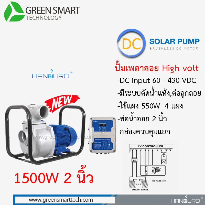 Handuro Solar Surface Pump 1500W ท่อน้ำออก 2 นิ้ว รุ่นนี้มีกล่องควบคุมแยกจากตัวปั้ม สำหรับใช้สูบน้ำในงานเกษตร สูบน้ำผิวดิน งานระบบสปริงเกอร์ รดน้ำต้นไม้ในสวน ในไร่ สูบน้ำเข้าสระ สูบน้ำเข้านา หรือส่งน้ำในระบบประปาหมู่บ้าน โดยเฉพาะในที่ไม่มีไฟฟ้า เข้าถึง ตัวควบคุม สามารถต่อต่ออนุกรมจากแผงโซลาร์เซลล์ เข้ากล่องควบคุม ใช้งานได้ทันที มีระบบตัดน้ำแห้ง ต่อลูกลอยได้ สามารถส่งน้ำได้ในปริมาณมาก เป็นปั๊มที่ง่ายต่อการซ่อมบำรุง มีประสิทธิภาพในการส่งน้ำที่ดีกว่า “ปั๊มหอยโข่ง” โดยสามารถส่งน้ำได้ในระยะทางที่ไกล มีความสม่ำเสมอ แต่ จะไม่เหมาะกับการส่งสูง ส่งแนวดิ่งเพราะทำแรงดันได้น้อยกว่าปั๊มหอยโข่ง